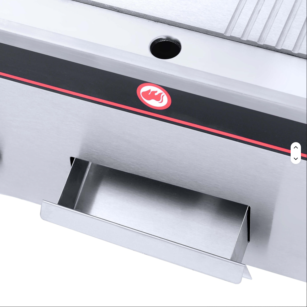Plancha profesional de contacto con una placa de cocción robusta de acero acanalado que retiene el calor. Dos quemadores con controles independientes y funcionamiento simultáneo.