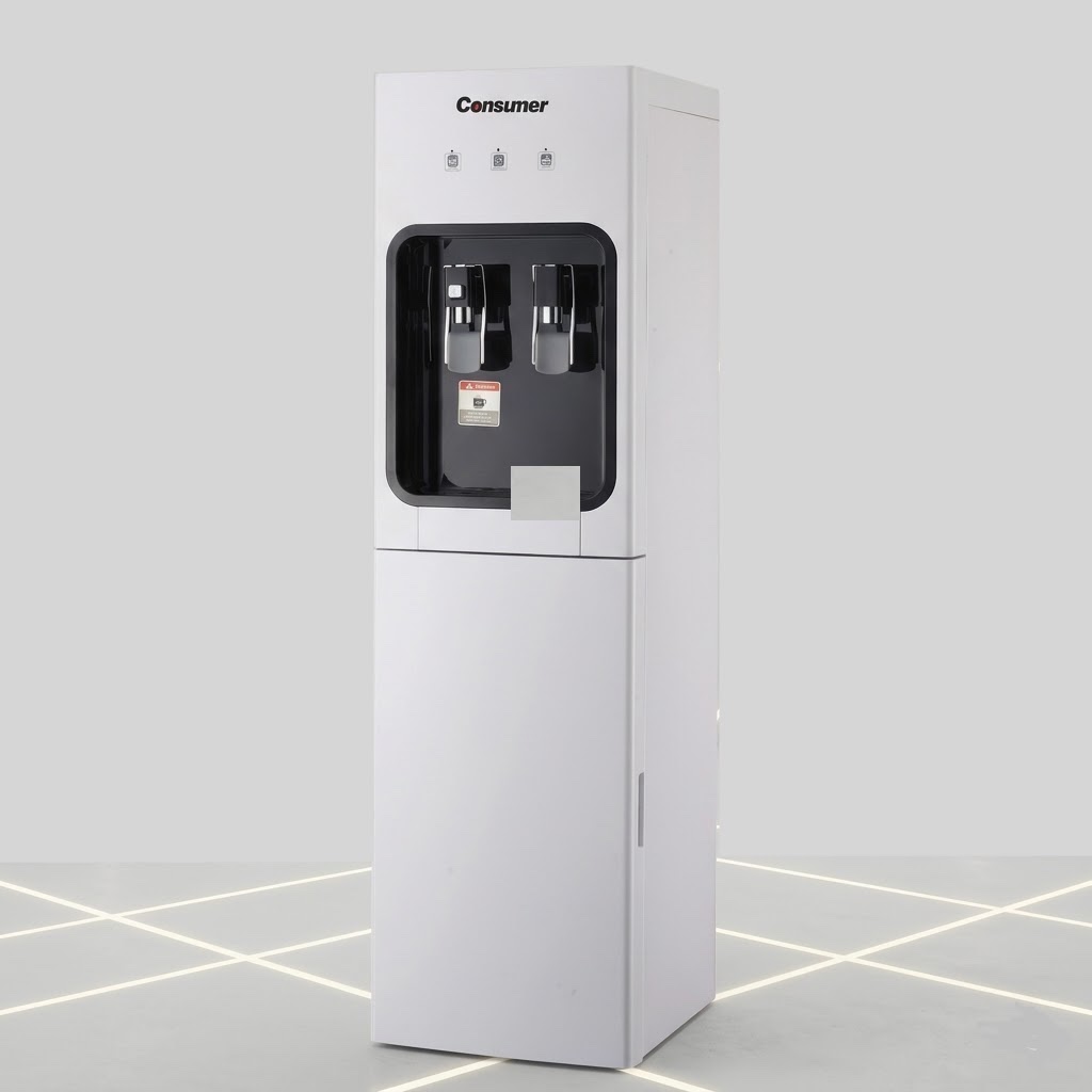 Modelo de pie, de diseño renovado con botellón interno. Este dispenser ofrece agua fría y caliente. Funciona con un sistema de carga interna que evita tener que colocar el bidón de agua en la parte superior y ofrece un aspecto más armónico en el ambiente. Es ideal para oficinas, salas de espera y hogares, combinando eficiencia con estética.