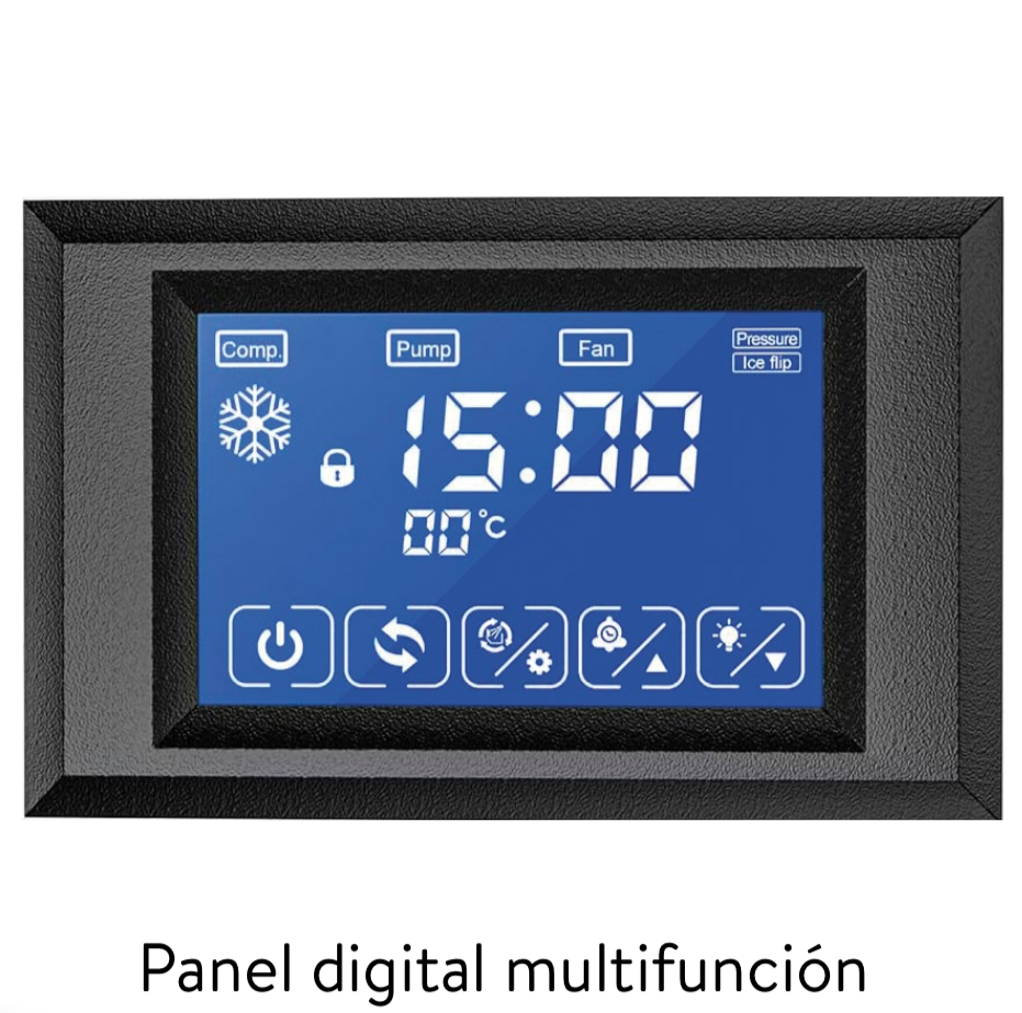 - Ajustes de tiempos, grosor de hielo, limpieza automática y monitoreo del hielo