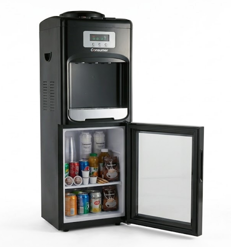 Este elegante dispenser de pie ofrece agua fría y caliente de forma instantánea y además cuenta con una heladera integrada para mantener bebidas o snacks a mano. Es ideal para oficinas, salas de espera y hogares, combinando comodidad y versatilidad.