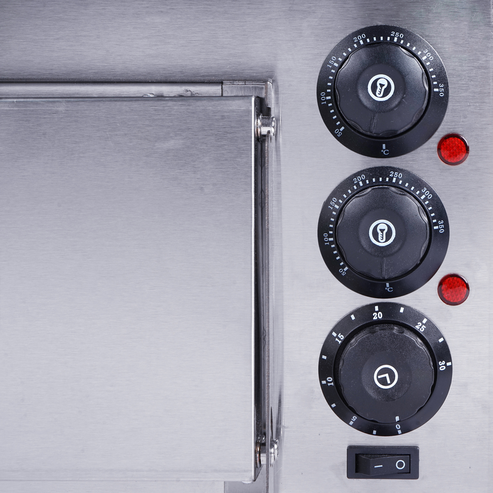 • Puerta reforzada y vidrio de alta temperatura para supervisar la pizza.