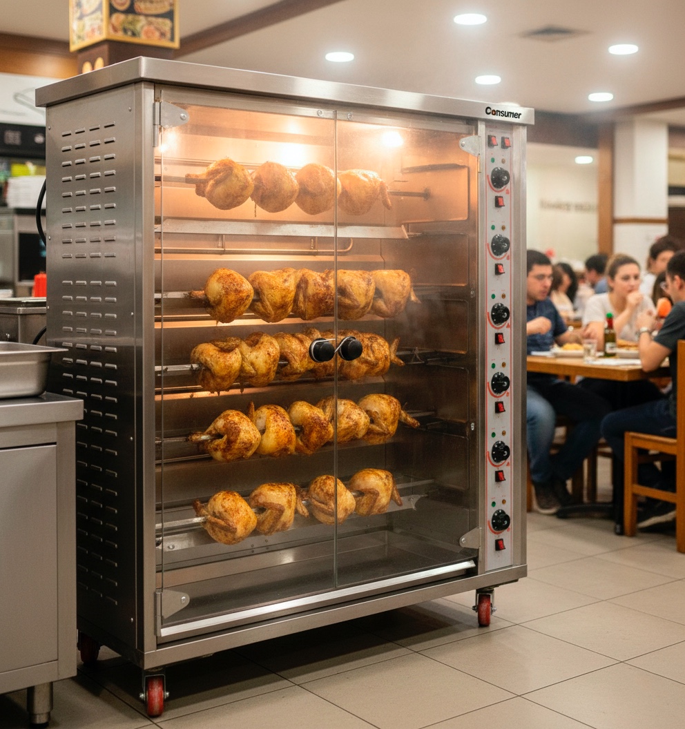 Este espiedo asador comercial cuenta con quemadores y rodillos rotativos independientes, potencia de fuego ajustable y una capacidad para asar 30 pollos simultáneamente. Ideal para cocinas de alta producción, para asar pollo y otras carnes. Garantiza una rotación suave, cocción uniforme y obtiene resultados de alta calidad.