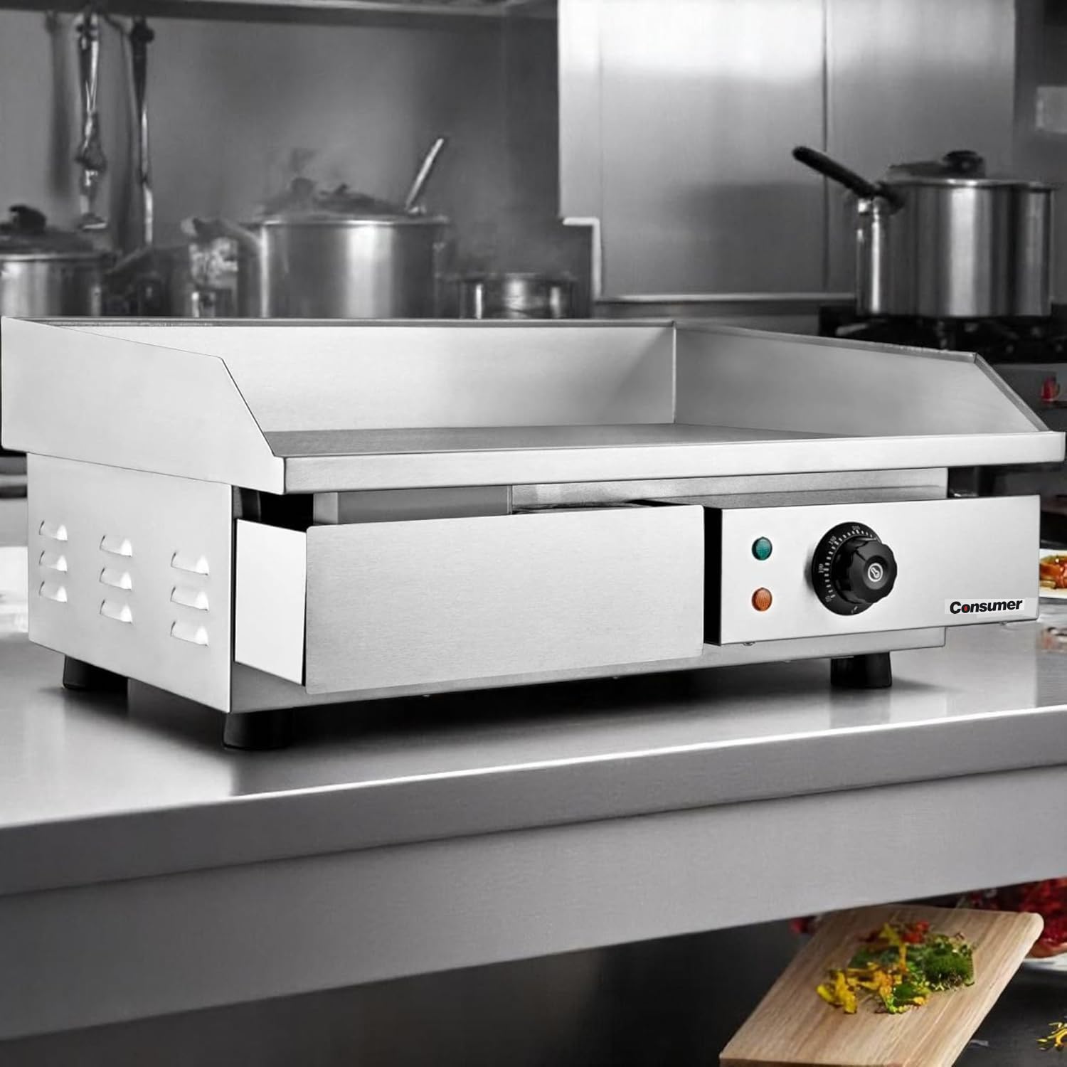Plancha de contacto eléctrica diseñada para cocinas que demandan velocidad, eficiencia y facilidad de uso. Su superficie lisa de acero distribuye el calor de manera uniforme, permitiendo cocinar sin dejar marcas de parrilla. Con un amplio espacio, prepara múltiples alimentos simultáneamente, asegurando mantener el ritmo con los pedidos. Es ideal para cocinar todo tipo de carnes, huevos fritos, embutidos, verduras, panqueques y tofu. Es una herramienta versátil para toda cocina.